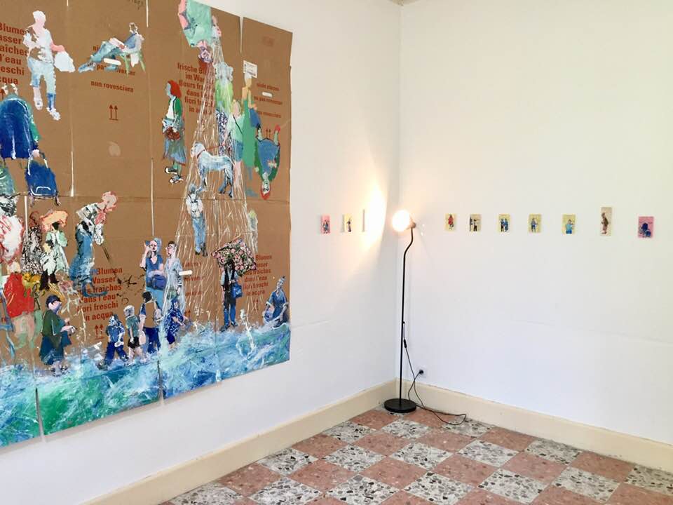 Northeast France, a tiny gem of a town that harbors under its ass, Pardon my French, bubbling underground baths rich with healing waters. The water flows from the corner of every street and path, probably underneath the houses too, and bring with it ancient memories related to the eternal transparent fluid, and myths, goddesses and ideas that have been here since forever and overwhelm the memory while you’re busy with everyday activities. Rivers, springs, streams, and brooks rush side by side, meeting and separating again and again beneath the azure sky, flying with the wind mid-August, rinsing thoughts and feelings until they become clear, purging like fragrant white laundry before Saturday. It’s quiet and cozy. Green leaves are budding everywhere, soft hills painted with a blend of cobalt blue and yellow are growing sprouts and ferns and tall tall trees that thouch the beyond. Something about growth and change and the right forces and the far and near days that come closer to each other down here. I came for one month and I am drawing little lonely people on old library cards in Hebrew and French, playing with the idea of a cross-cultural encounter. The miniature platform bears the names of writers and books and people who borrowed the books to read. The library book they took home was with them on the chair, on the table, on the armchair, in bed, wherever they read, wherever they lived, wherever they dreamed and fantasized about worlds and stories within the text. To this great little literary space, I add images, portraits that come from the stock on my cellphone. Images of people with constant presence in my life, images of new recent people as well as those who appeared before my eyes for just a moment, here and now in and around this small town. Further in the process, I gather the images into groups on large formats, in order to establish other literary pictorial spaces, attempting with all my might, regardless and despite everything, to connect roots to heaven.