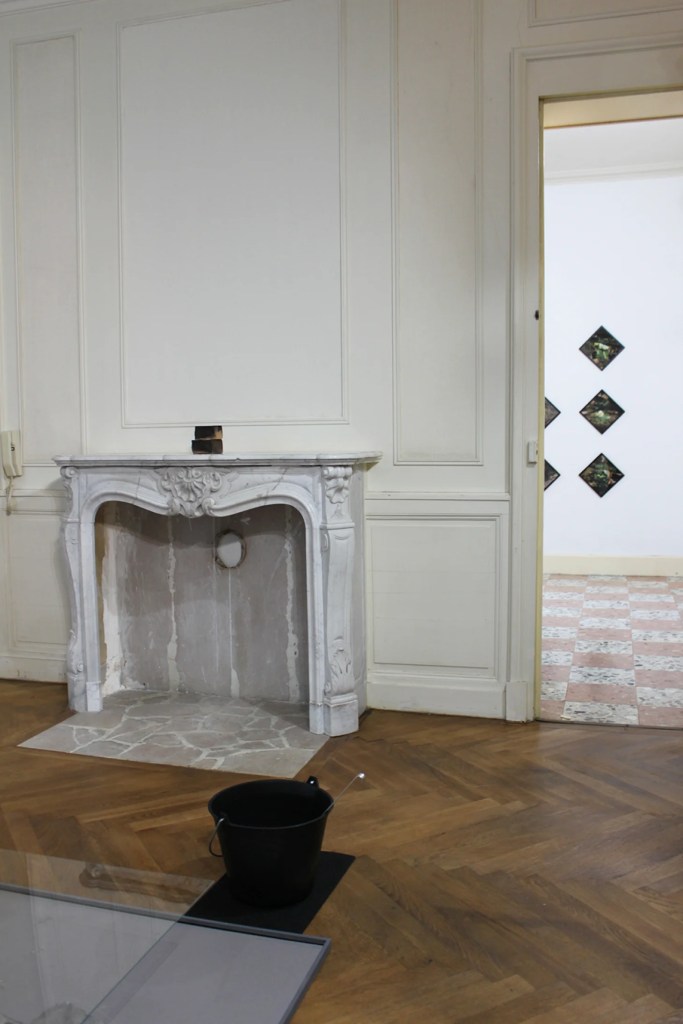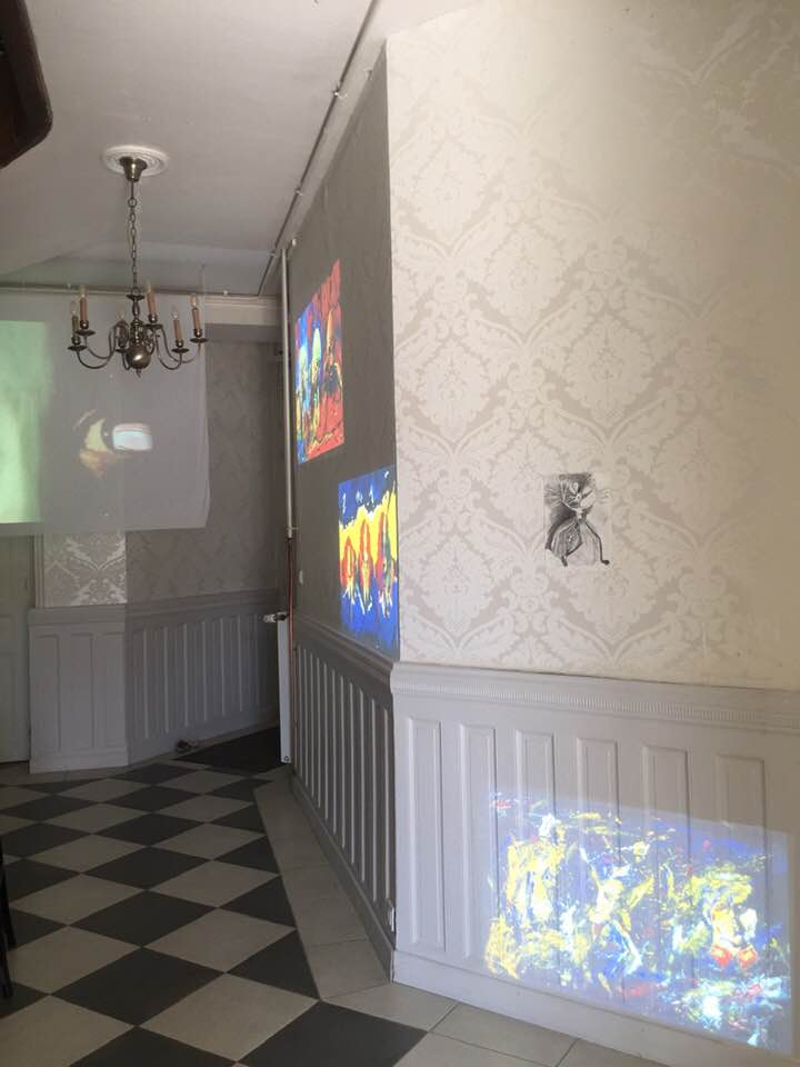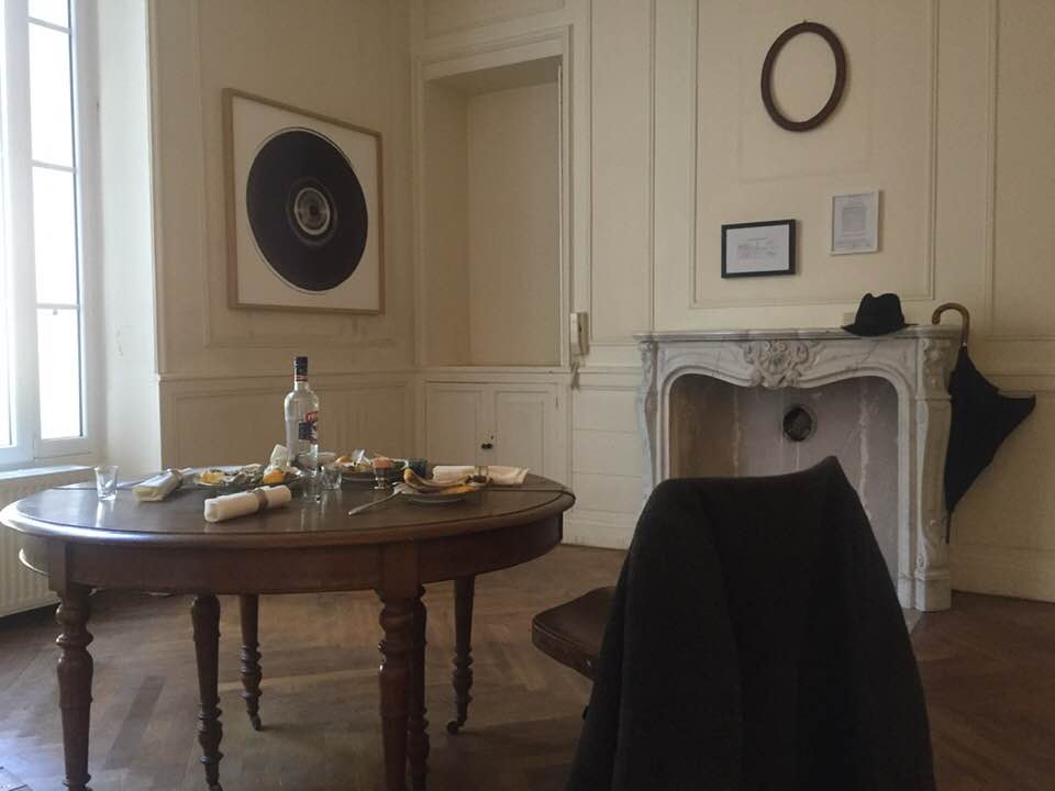 The starting point of his second work inside the EAC was the installation / performance of CHFD entitled Dinner & Invitations: An Oval Table on which the cover is set for 4 people. 4 napkins with rings, oyster shells, glasses and a bottle of vodka, suggest an event, a reception took place. The guests disappeared or were absent as evidenced by the hat and the umbrella suspended from the fireplace and the mantle on the back of one of the chairs. The private, intimate nature of the room that hosts the staging makes it possible to target the interventions in a precise way. The style of the building atmosphere of the room are all elements that contribute to fuel a plausible scenario. The circular shape of the subject of the big photograph (RDN # vinyl) corresponds to the oval shape of the table. A painting in a private space gives some indications on the personality of the owner of the place. The simplicity and austerity of the black disc, while resembling the oval shape of the table is consistent with the other elements that constitute CHFD’s room: hat, umbrella and coat. Faced with these elements, slightly set back in a cupboard, a monitor broadcasts a video that shows a luminous disc, held between thumb and index, oscillating, moving slightly on a repetitive sound background. Some guitar notes are looping just like the sequence.