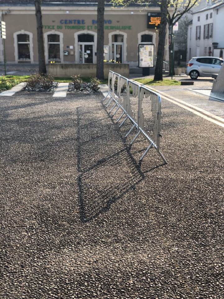 In his project for Bourbonne-les-Bains he showed art in public space, called: Parcours – Le Havre – Paris – Sion – Tokyo – Bourbonne-les-Bains, 2019. Material is plated metal. The artist works on the idea of the territory, the geographical space of a place that he visits and will lead him to reflect and make re-discover the viewer a city map through an object, a video , a sculpture. His intervention for the EAC consists of setting up five cut out Vauban Barriers on the Place des Bains in Bourbonne-les-Bains, revealing the re-drawn outline of the cities plan like Le Havre, Paris, Sion, Tokyo and Bourbonne-les-Bains. The viewer can discover through „the objects“ his city and wonder about the place where he evolves. There is a certain ambiguity in the artist’s work when the form can reveal an abstract „thing“ while revealing the idea of the territory, which weaves the link between the social and the place where it lives