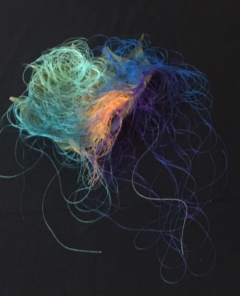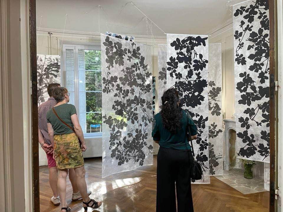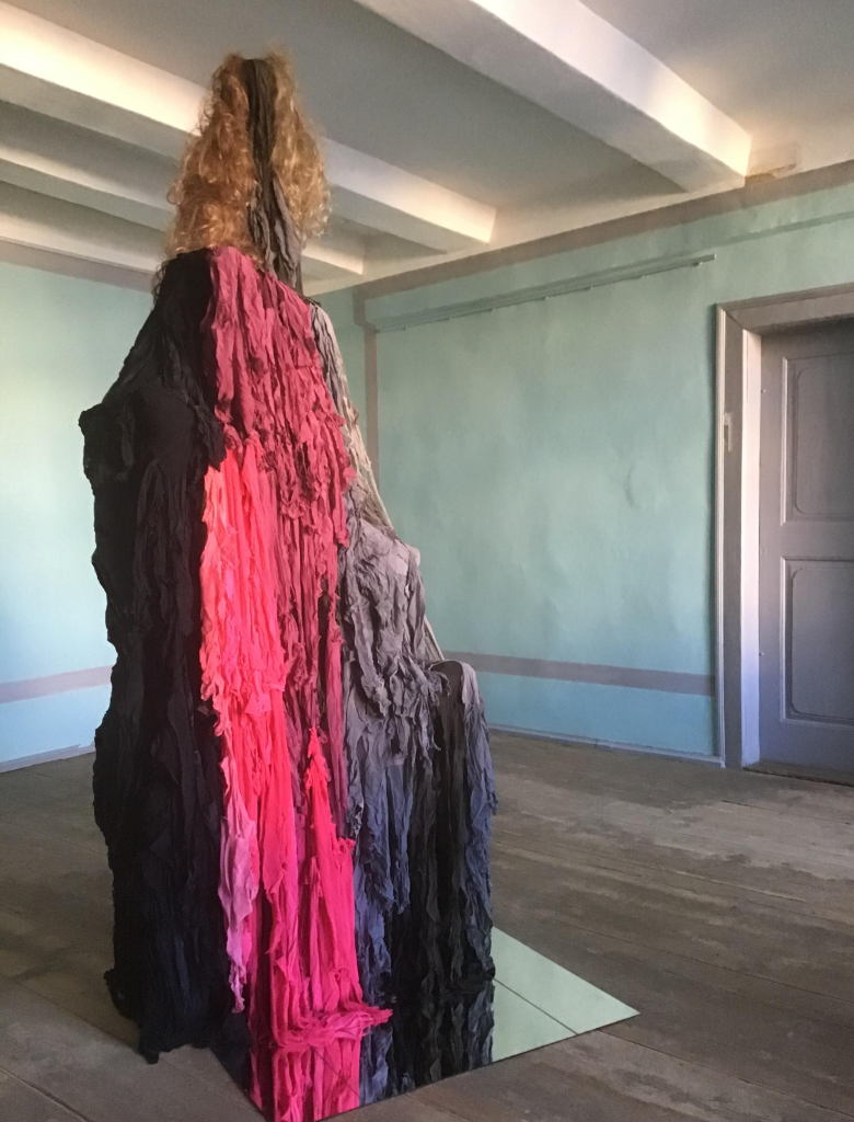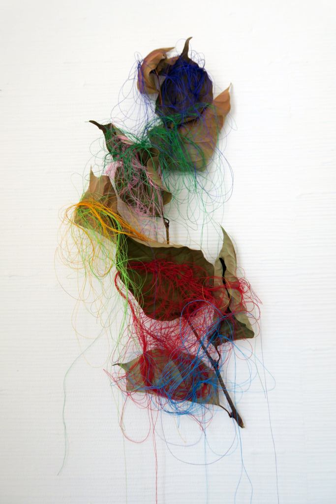 Some may see her as a fairy, exercising her magic and telling her tales. For Eun Young herself, when Corona began, she had no more places to go, everything was closed, no places left, exept the forests were still available for long walks each day. There she observed and found the beautiful dead leaves, branches, temporarely dying by the wind, rain, snow. All this dying in nature together with the dread of Corona made her want to blow new life into, to give them new clothes, create new forms with colorful threads. When Eun Young created them, spiders and their nets entered her mind, cocooning caterpillars and worms, spider moth veils. Different kinds of transformations happened. Finally Eun Young was able to travel now in summer and finds her material in the surrounding, blooming Bourbonne nature. She includes six children and one young teacher in her transformational work and all together is shown in the exhibition.