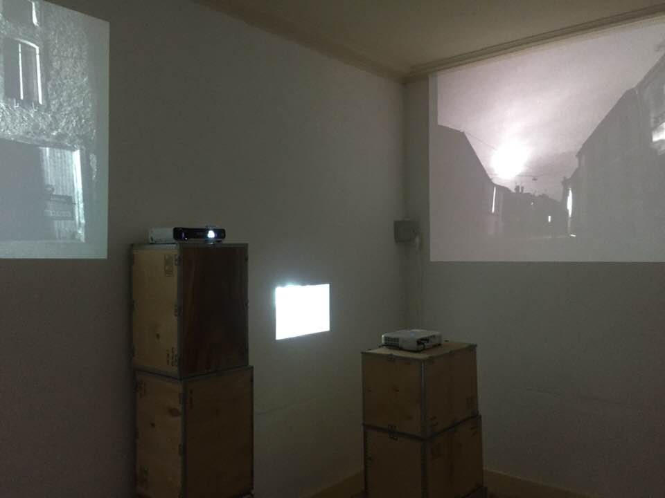 The repetition, short, hypnotic, reinforces the notion of timelessness. A magnifying mirror seeks the reflection of the circular lamp that is nearby. The magnifying effect distorts at times the reflected image, to give the object the appearance of a luminous disc. The brilliance of light then assumes a mysterious, mystical or spiritual dimension. He intervenes in response to the black disk. In the context of a potential narrative, he intervenes as the mind. Like the „shining“ of the room, which necessarily influences CHFD’s central room.The situation of the monitor placed in the cabinet whose door is half open avoids firstly that the camera as an object produces contemporary technology, interferes in the staging, and on the other hand, its manifestation is subtle but very present (sound and light).The third element is a dichromated gum print made using the principle of the camera obscura. This is a direct exposure through a magnifying glass, a light emission on a receiving medium that records or captures this situation. In this case the workshop window projected or reproduced on a support that is the canvas previously emulsified. The interest lies in the lag between the present moment that emits the luminous flux (daylight) and the notion of timelessness fixed on the canvas. The duration of exposure in this case is a full day and each time the operation is repeated, one or more days are added, focuses on the canvas. The receiver takes care of information and keeps it. It becomes memory.