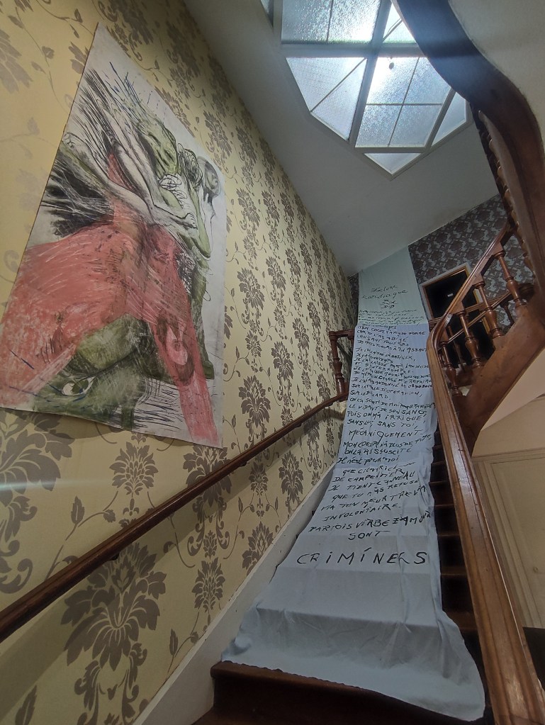 CHFD is interested in historical characters, fictitious and imaginary. For the first EAC Les Thermes expo he found Ltcol of the 1st Empire, Charles-Nicolas Mercier and Joseph Armand, half pay like the first and resident in Bourbonne at the fall of the Empire. The arrangement proposed by CHFD was a performance linking the author to the natives of the place. Other characters were also summoned for a strange ceremony where spirits of the great men were gathered in the room. The death of some brings others back to life around birth and death dates. The remains of the dinner were there to testify to the manifestation of their presence, just like the hat, the umbrella and the coat of the author. CHFD also wrote an invitation to the event at the last known addresses of both LCol, Mercier and Armand. If the post does not find them or their descents, the letters will be returned to the sender, CHFD, and will be placed on the fireplace in the exporoom.