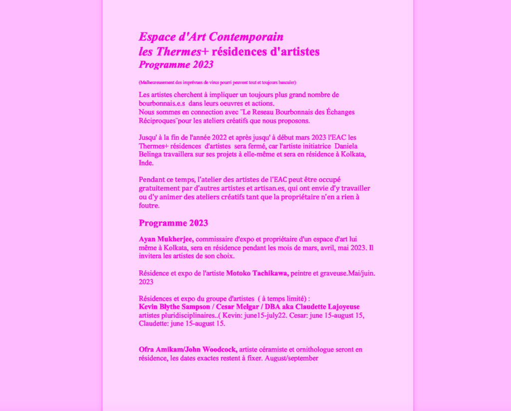 The News Section can also show participation of our artists in exhibitions taking place in the region. The artists who participate in our residency and exhibitions at EAC Les Thermes, not only enrich Bourbonne les Bain, but through their being here also enrich the rest of the region and the whole of France.