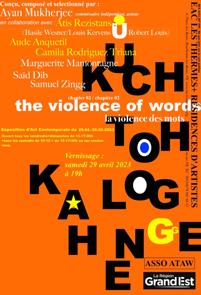 The first exhibition of the year 2023. The curator in residency, artist Ayan Mukherjee, has created an exhibition around the theme ¨Kuch Toh Log Kahenge¨/ ¨the violence of words-la violence des mots¨ in dialogue with ¨Atis Rezistans¨(three members of them: Basile Wesner, Louis Kervens, Robert Louis), http://www.atis-rezistans.com , Aude Anquetil, https://www.audeanquetil.com Camila Rodriguez Triana, https://es.wikipedia.org/wiki/Camila_Rodr%C3%ADguez_Triana Marguerite Mamontagne aka DBA, Saïd Dib, https://www.brouillons-de-culture.fr/article-said-dib-insolent-et-solaire-57766155.html?fbclid=IwAR2GOGfkdJubufkIZmw-8Kg8SQDEW0eInCvEz9h4-pE6qQ3Ss7jff144zwg , Samuel Zingg. https://www.instagram.com/samsemillya/ The installed works are interconnected. You will find interactive textworks, interactive sculptures, videos, sculptures, paintings, drawings, music.