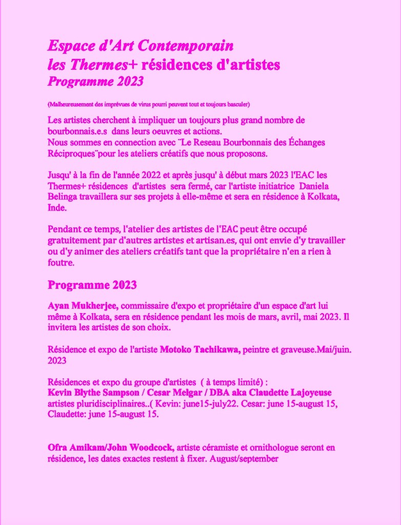 The first exhibition of the year 2023. The curator in residency, artist Ayan Mukherjee, has created an exhibition around the theme ¨Kuch Toh Log Kahenge¨/ ¨the violence of words-la violence des mots¨ in dialogue with ¨Atis Rezistans¨(three members of them: Basile Wesner, Louis Kervens, Robert Louis), http://www.atis-rezistans.com , Aude Anquetil, https://www.audeanquetil.com Camila Rodriguez Triana, https://es.wikipedia.org/wiki/Camila_Rodr%C3%ADguez_Triana Marguerite Mamontagne aka DBA, Saïd Dib, https://www.brouillons-de-culture.fr/article-said-dib-insolent-et-solaire-57766155.html?fbclid=IwAR2GOGfkdJubufkIZmw-8Kg8SQDEW0eInCvEz9h4-pE6qQ3Ss7jff144zwg , Samuel Zingg. https://www.instagram.com/samsemillya/ The installed works are interconnected. You will find interactive textworks, interactive sculptures, videos, sculptures, paintings, drawings, music.